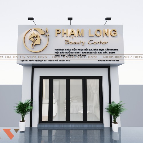Biển hiệu của spa Phạm Long Beauty Center được thiết kế theo phong cách tối giản nhưng đầy tinh tế. Nổi bật trên nền trắng là logo với hình ảnh khuôn mặt phụ nữ kết hợp hoa, thể hiện sự thanh lịch và chuyên nghiệp. Tên spa được in nổi với tone vàng gold sang trọng, kết hợp với dòng chữ "Beauty Center" mềm mại, tạo nên sự cuốn hút ngay từ cái nhìn đầu tiên.