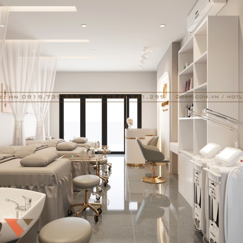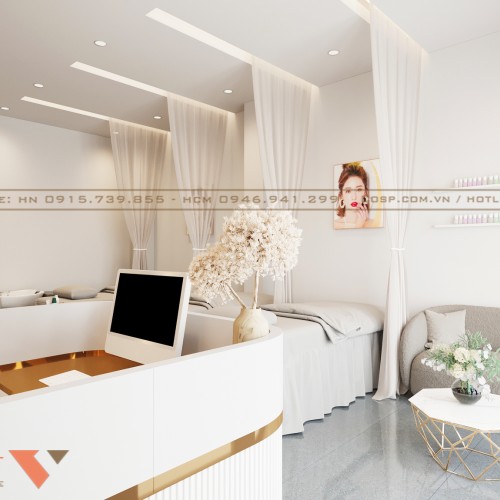 Bước vào spa, khách hàng sẽ được chào đón bởi khu vực quầy lễ tân sang trọng. Quầy được thiết kế với tone màu trắng chủ đạo, kết hợp với những đường viền ánh kim màu vàng. Trên tường phía sau là logo spa được gắn nổi với hệ thống đèn hắt sáng, làm nổi bật thương hiệu một cách tinh tế.