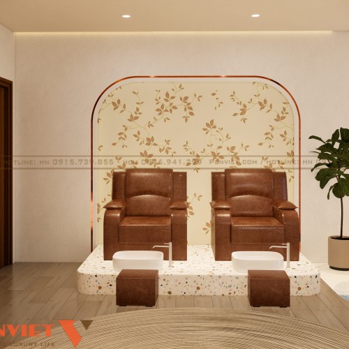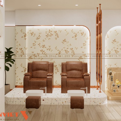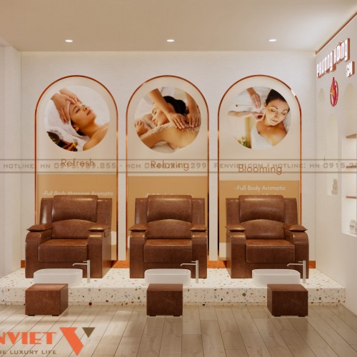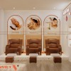 Khu vực ghế ngâm chân được bố trí ngay phía ngoài. Cách sắp xếp hàng ghế thẳng giúp tối ưu diện tích sử dụng. Mỗi ghế đều có bồn ngâm riêng, đảm bảo tiện nghi và riêng tư tương đối.