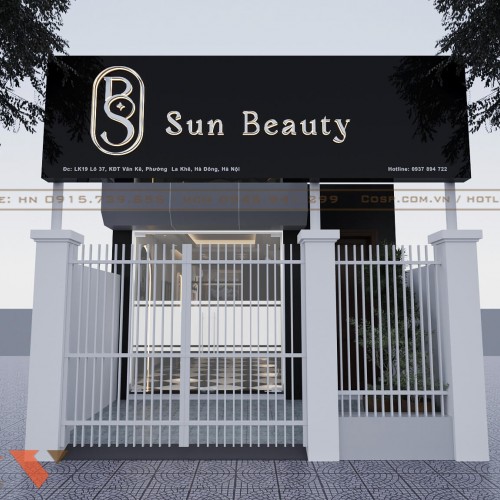 Mặt tiền của Spa Sun Beauty gây ấn tượng mạnh với hệ bảng hiệu màu đen sang trọng, chữ nổi màu vàng kim dễ dàng thu hút sự chú ý. Bảng hiệu sử dụng chất liệu Alu, bộ chữ mica kết hợp với đèn LED giúp tăng độ nhận diện thương hiệu vào ban đêm. Bên dưới bảng hiệu là thông tin địa chỉ và số hotline để khách hàng dễ dàng liên hệ.