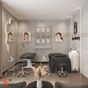 Hệ thống kệ treo tường được bố trí gọn gàng để trưng bày các sản phẩm chăm sóc da và dụng cụ chuyên dụng. Trên tường là những bức tranh nghệ thuật của các người mẫu với phong cách trang điểm ấn tượng, tạo cảm giác chuyên nghiệp và thẩm mỹ.