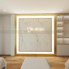 Một trong những yếu tố làm nổi bật không gian là vách thương hiệu nằm ở vị trí trung tâm. Vách được thiết kế với sự kết hợp của đá marble trắng, họa tiết vân mây tinh xảo, mang lại vẻ đẹp vừa hiện đại vừa quý phái. Khung viền inox mạ vàng gold hình vuông tạo sự tương phản ấn tượng và giúp không gian thêm phần sang trọng.