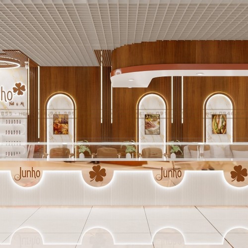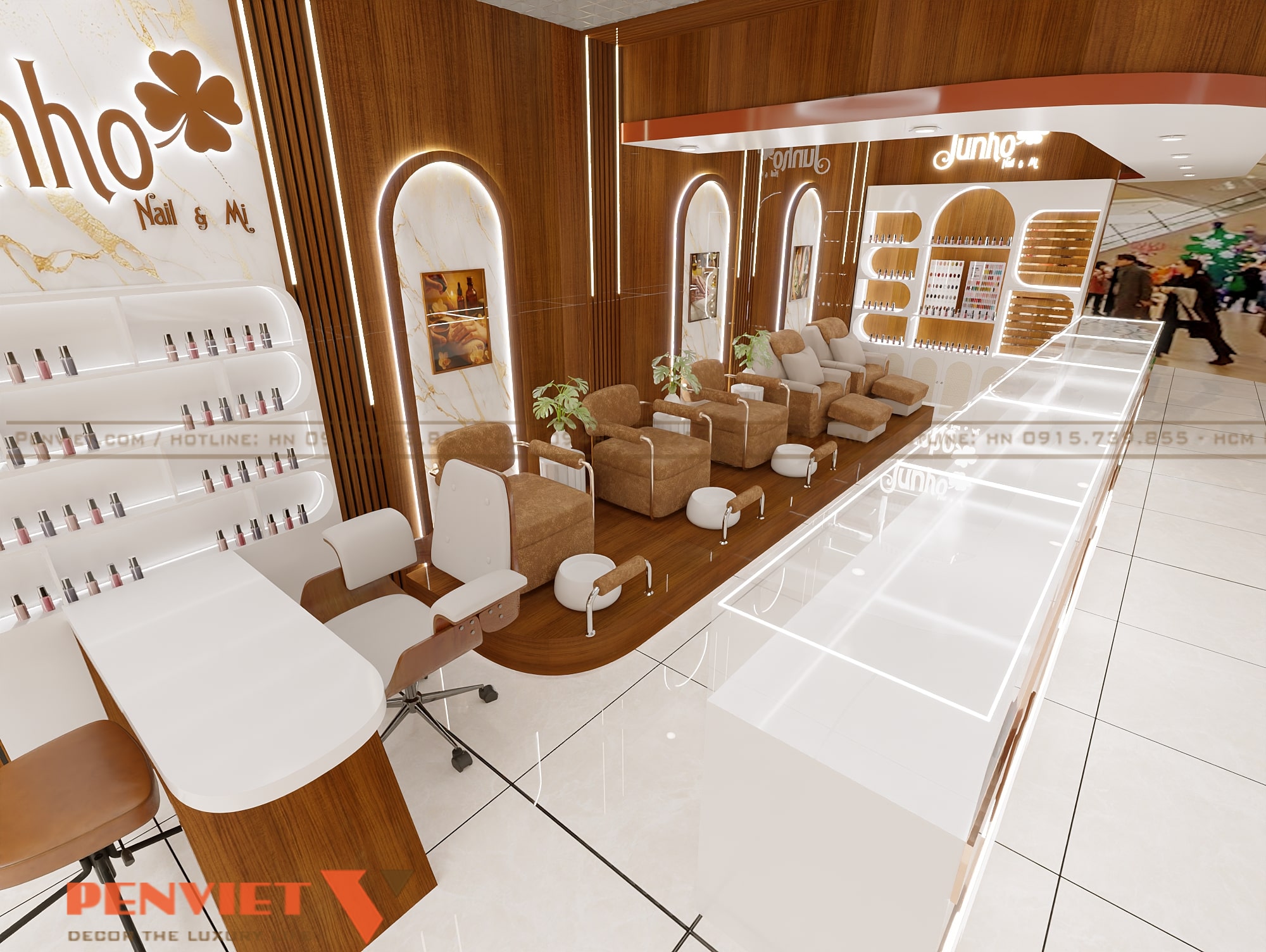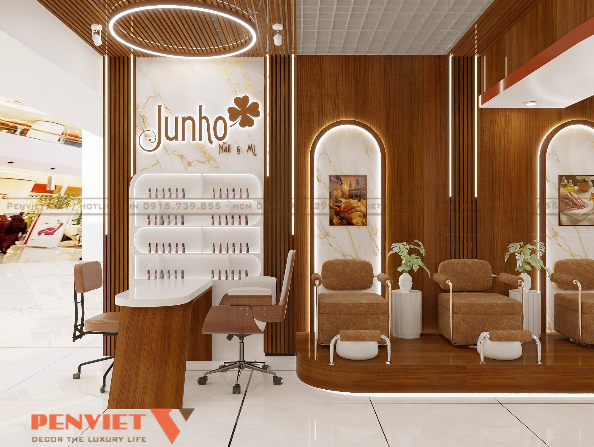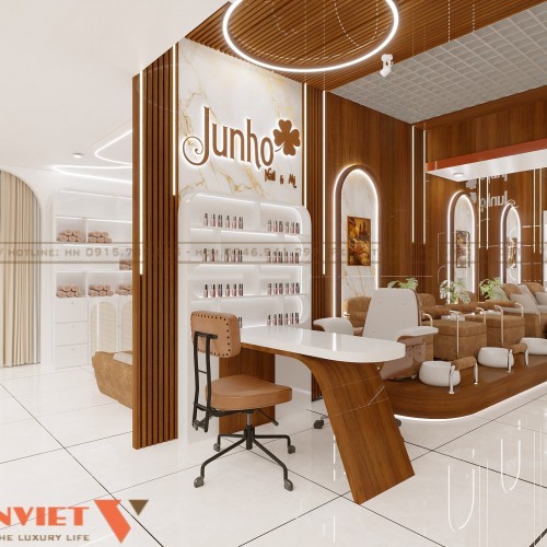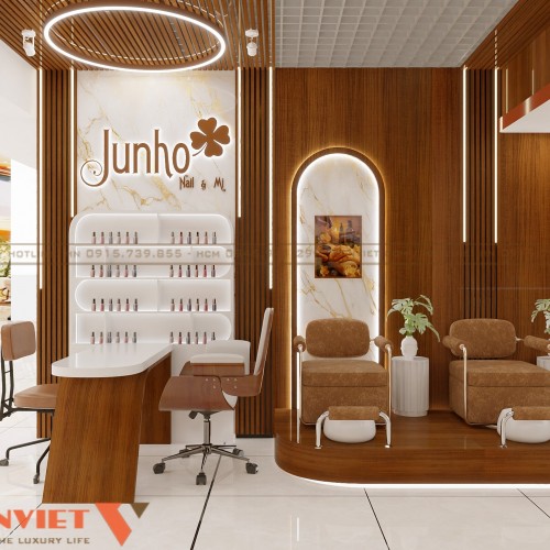 Thiết kế tiệm Nail Junho được định hướng theo phong cách hiện đại, tập trung vào sự gọn gàng và cảm giác cao cấp. Không gian sử dụng bảng màu ấm với gỗ nâu kết hợp trắng sáng, giúp tổng thể vừa sang trọng vừa gần gũi. Đây là lựa chọn phù hợp cho các chủ tiệm nail đang muốn cải tạo không gian nhưng vẫn giữ được sự thân thiện, dễ tiếp cận với nhiều nhóm khách hàng.