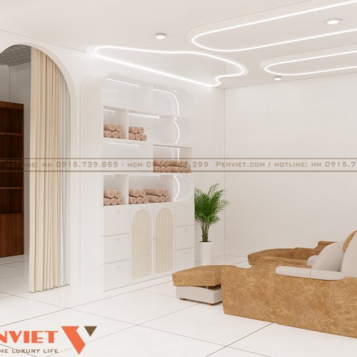 Các mảng tường được xử lý tinh tế với đường cong mềm mại, tạo điểm nhấn thị giác và giảm cảm giác khô cứng thường thấy ở mặt bằng nhỏ. Thiết kế hiện đại nhưng không quá cầu kỳ, giúp tiệm nail duy trì được vẻ đẹp lâu dài và dễ dàng làm mới trong tương lai. Định hướng này rất phù hợp với mô hình kinh doanh nail tại khu vực đô thị như Hà Nội.