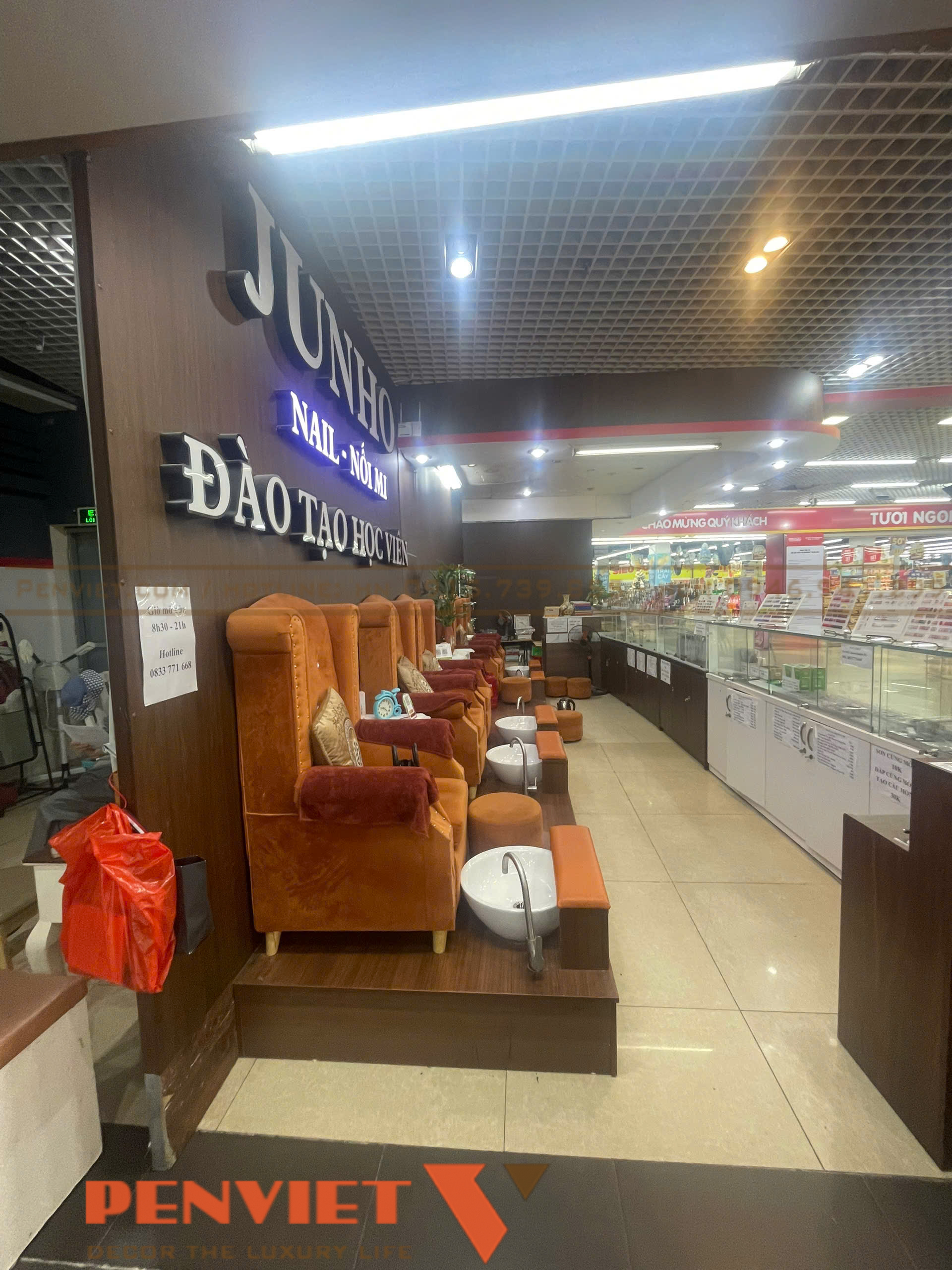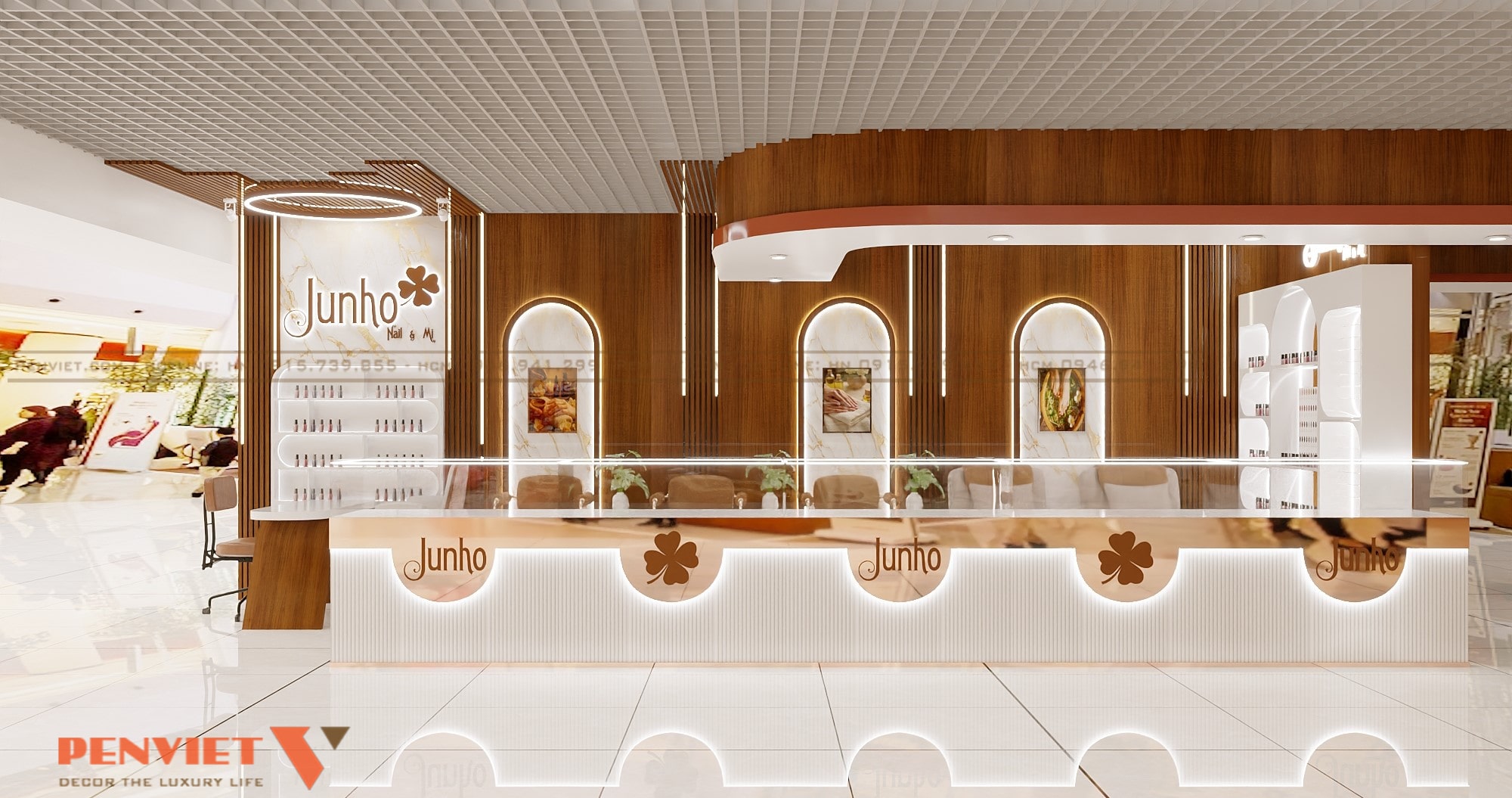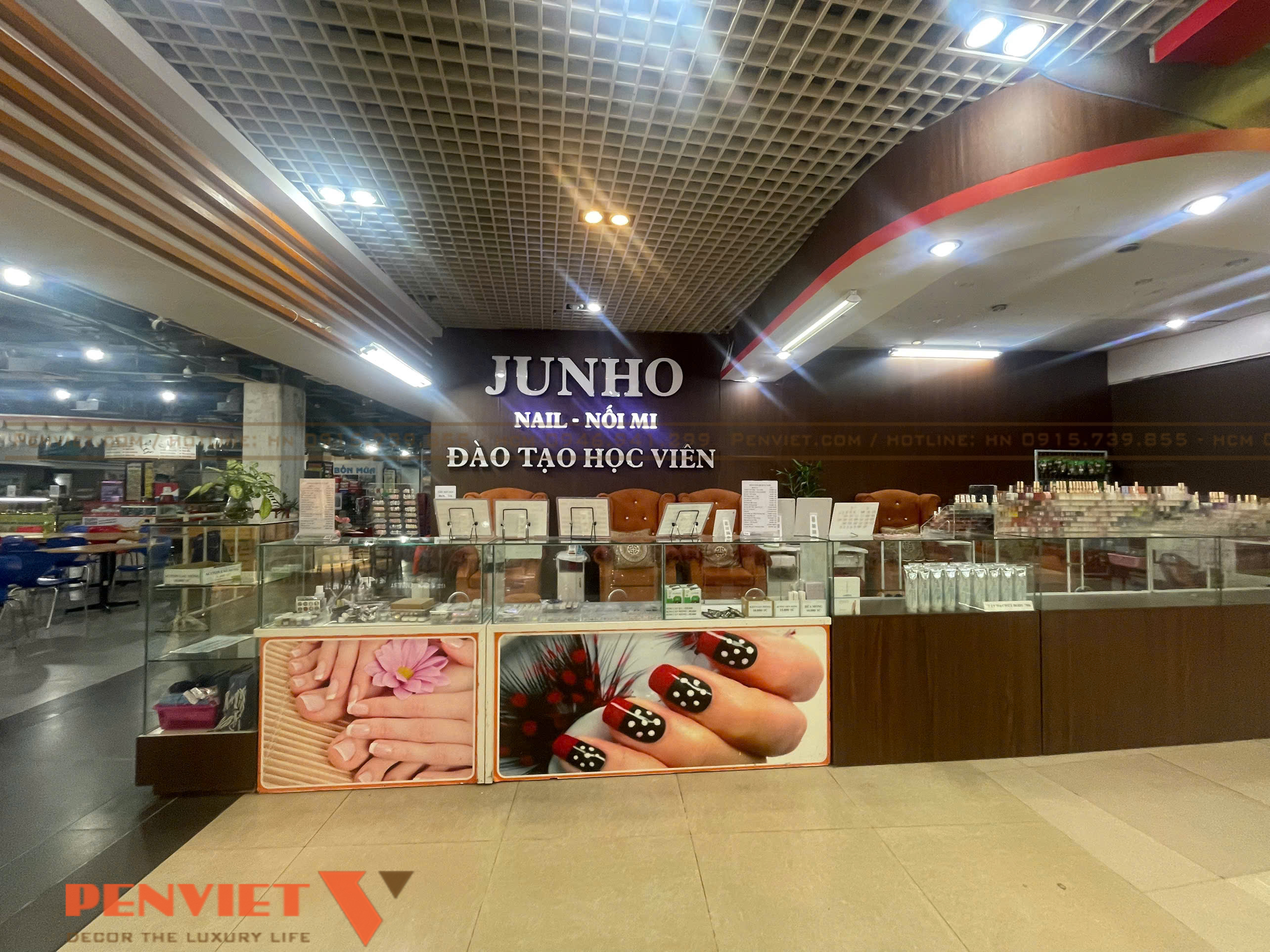 Logo và tên thương hiệu Nail Junho được đặt ở vị trí dễ nhìn, tạo ấn tượng rõ ràng ngay từ khu vực đầu tiệm. Thiết kế nhận diện không quá phô trương nhưng đủ tinh tế để ghi nhớ trong tâm trí khách hàng. Đây là yếu tố quan trọng đối với các chủ tiệm nail đang muốn xây dựng thương hiệu bài bản trong quá trình cải tạo không gian.