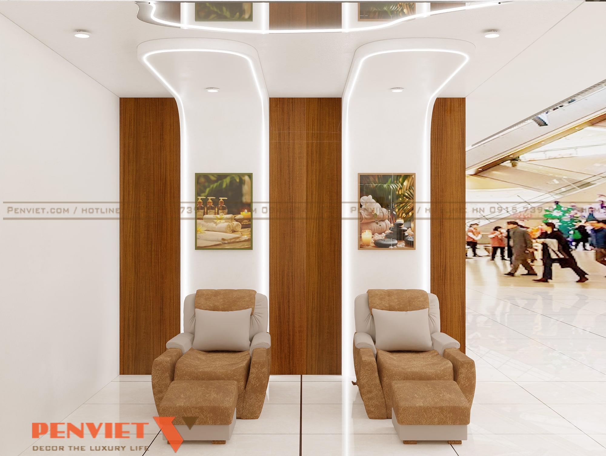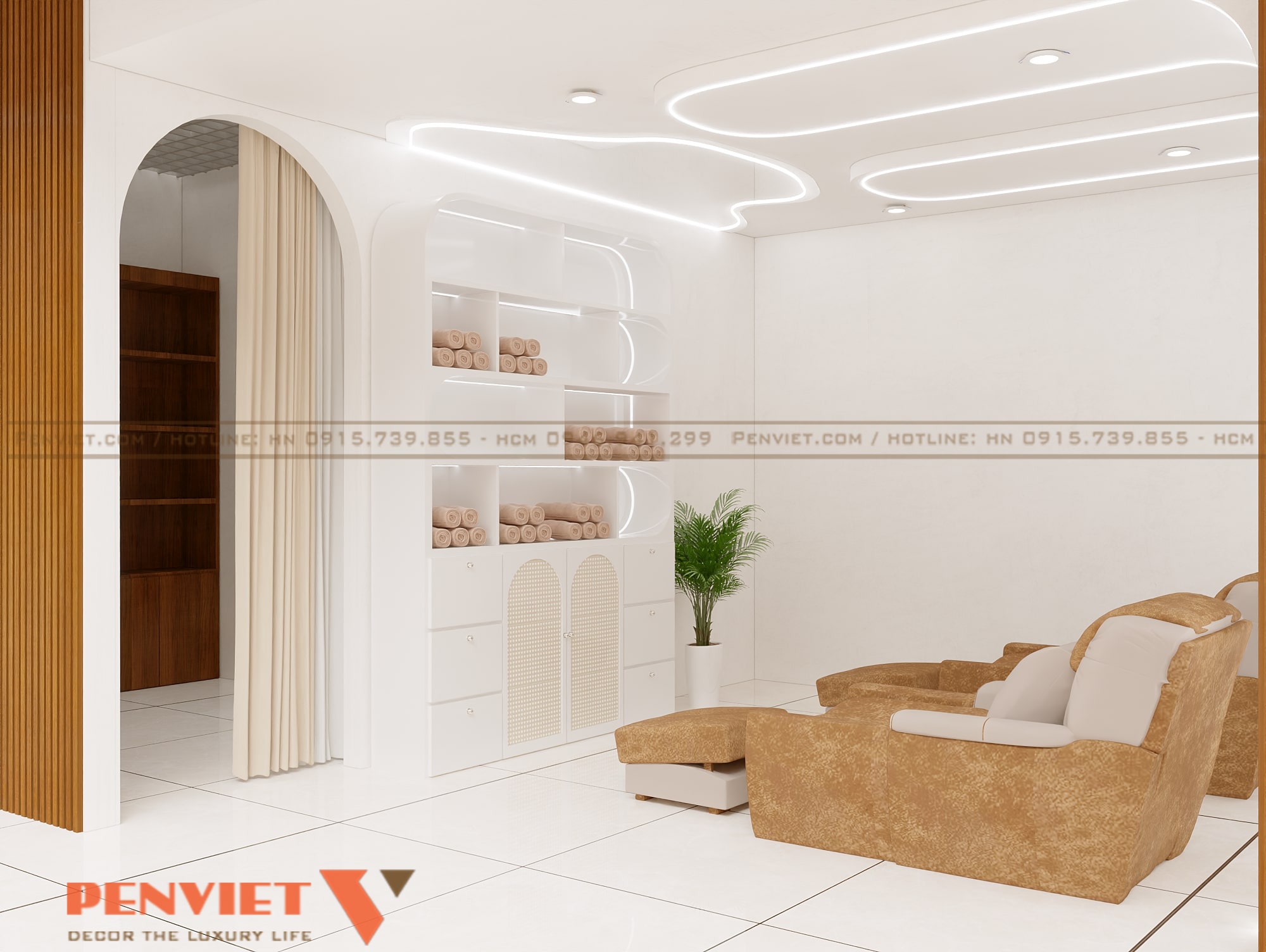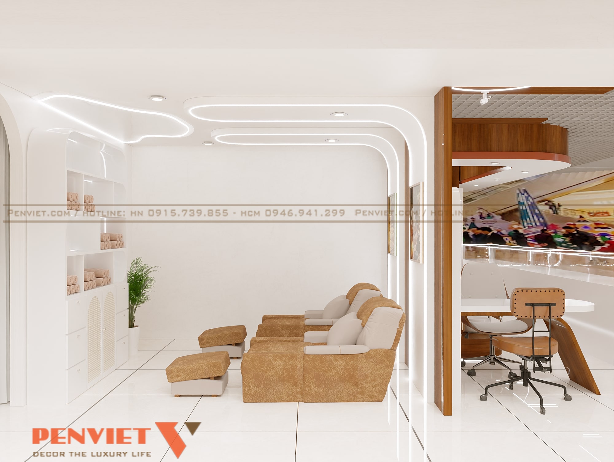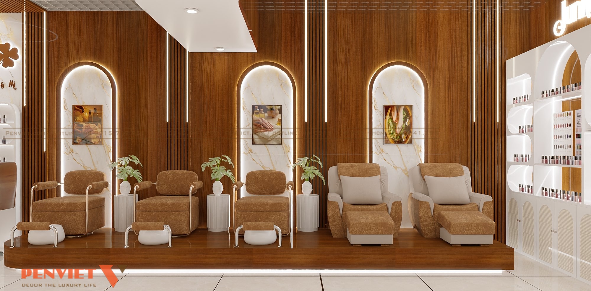 Khu vực bàn làm nail tay được bố trí gần quầy trưng bày sơn, giúp thao tác nhanh và thuận tiện trong quá trình phục vụ. Ghế pedicure được đặt trên sàn nâng nhẹ, vừa phân tách không gian vừa tạo cảm giác riêng tư cho khách. Đây là giải pháp cải tạo thông minh cho các chủ tiệm nail đang sở hữu mặt bằng nhỏ nhưng muốn tăng số lượng chỗ ngồi mà không gây chật chội.