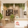 Chất liệu: Gỗ melamine, mây tre, tranh phát sáng, kính và đèn rọi ánh sáng trắng, đèn trang trí.