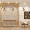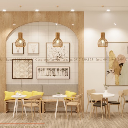 Bên cạnh đó, việc lựa chọn các thiết kế bàn đa dạng cũng giúp cho khách hàng cho khách hàng có thêm nhiều sự lựa chọn về vị trí. Dãy bàn dài sát tường bằng gỗ MDF với các ghế quầy bar khung gỗ tự nhiên bố trí phía ngoài cũng giúp tiết kiệm không gian, khiến cho lối vào trở nên thoáng, rộng.