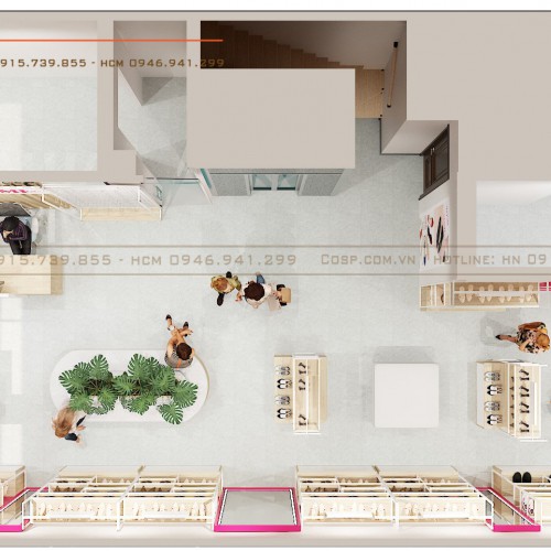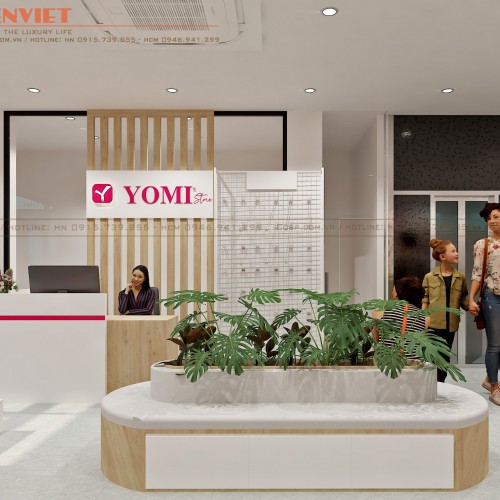 Cây xanh được chúng tôi đưa vào trong mẫu thiết kế nội thất cửa hàng giày Yomi mang lại sự thông thoáng, thân thiện cho cửa tiệm.