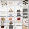 Phía bên này là hệ tủ trưng bày túi sách rất sang trọng. Được làm trên nền gỗ MDF chống ẩm phủ Melamine trắng đẹp, các đợt gỗ chắc chắn trưng bày những túi sách cao cấp được bao bọc bởi alu gương. Phía bên trên là những bức tranh sản phẩm đẹp và tranh in PP kèm theo Bộ chữ logo thương hiệu các dòng sản phẩm: mica dẹt 4mm.