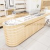 Ngay chính giữa mặt bằng, chúng tôi thiết kế và lắp đặt hệ tủ trưng bày bằng chất liệu gỗ MDF phủ melamine. Phần đầu kệ có gắn thêm 1 bàn nhỏ bằng gỗ MDF phủ melamine, chân sắt sơn tĩnh điện để khách hàng có thể nhận tư vấn từ nhân viên ngay tại đó.