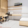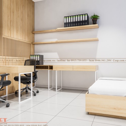 Phía trong cùng sau lớp vách ngăn quầy thu ngân là khu vực khám và kiểm tra mắt. Tại đây, có bố trí một giường bệnh nhân được làm từ khung gỗ MDF, đệm bọc da và một bộ bàn ghế giúp khách hàng hàng có thể theo dõi được những lời tư vấn về sức khỏe mắt từ phía bác sĩ.