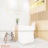 Đi hết khu vực trưng bày mắt kính là đến quầy thu ngân của shop. Tại đây, chúng tôi đã lựa chọn chiếc bàn làm việc màu trắng khá rộng rãi để có thể kết hợp vừa là nơi thanh toán và là nơi tư vấn, hỗ trợ khách hàng. Ngay phía sau có bố trí thêm một vách ngăn bằng gỗ MDF sơn O7.
