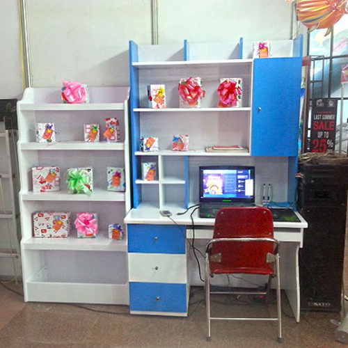 Bàn học, giá sách và kệ trưng bày đồ lưu niệm. Những món quà nội thất Hoàng Gia dành cho bé được bày sẵn trên các sản phẩm mẫu