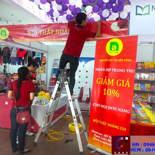 Ngoài ra, những vật dụng trang trí không thể thiếu khác như băng rôn, standlee, đèn lồng, ... cũng góp phần khiên gian hàng trở lên bắt mắt và giới thiệu thương hiệu công ty với khách tham quan.