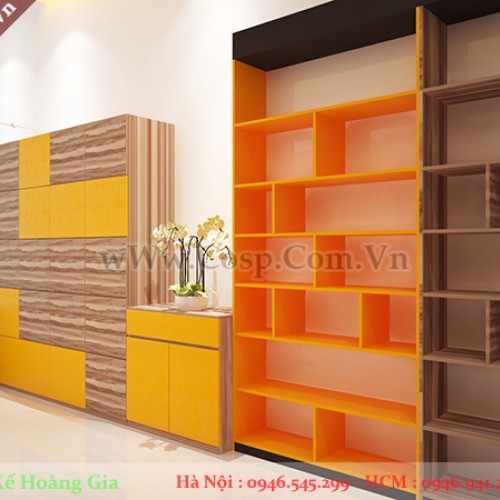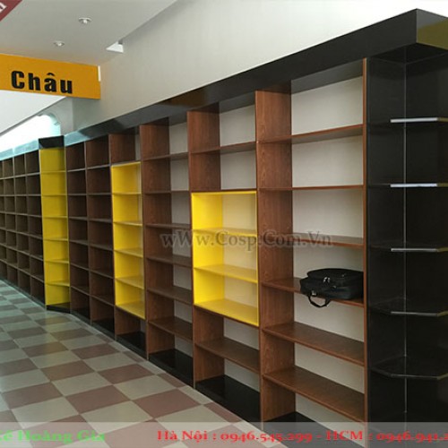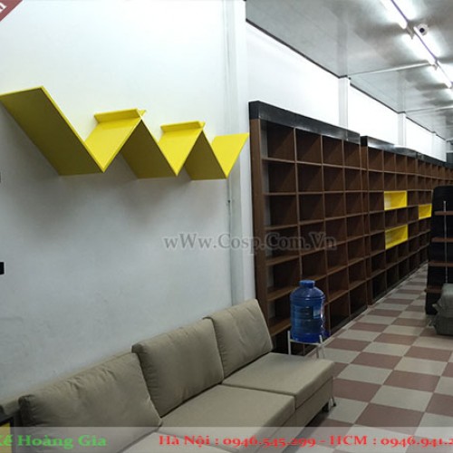 Từng giá sách ngăn tầng cao được xếp ngay ngắn sát tường nhằm tối ưu không gian trưng bày tốt hơn. Khác với các giá sách thông thường, chúng tôi sử dụng loại giá có các ô thoáng xen kẽ để tạo chút khác biệt cho nhà sách Hải Châu. Những kệ giá này đều được làm bằng gỗ MDF phung sơn chắc chắn mà vẫn đảm bảo được tính thẩm mỹ cho thiết kế nhà sách Hải Châu.