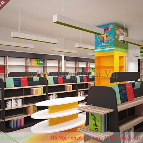 Bên trong không gian trưng bày, ngoài các giá sách lớn dựng sát tường, chúng tôi còn sử dụng thêm các kệ giá đứng dáng thấp. Những kệ giá này được xếp thẳng tạo thành những hàng lối đi lại thuận tiện. Loại kệ này rất hay được sử dụng trong các thiết kế cửa hàng sách vì nó giúp khách hàng nhìn thấy được từng khu vực bán sách dễ dàng hơn trước hàng nghìn đầu sách trong một không gian rộng lớn như vậy.