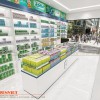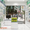 Việc sắp xếp hệ tủ trưng bày trung tâm bằng gỗ MDF chống ẩm phủ Melamine, kính cường lực liên kết với quầy thu ngân tạo thành hệ tủ chữ L khéo léo phân chia không gian làm việc của nhân viên với không gian đón khách. Đồng thời, điều này cũng mở rộng khu vực tư vấn, ra lẻ thuốc, mang đến sự thuận tiện cho cả dược sĩ lẫn người mua hàng.