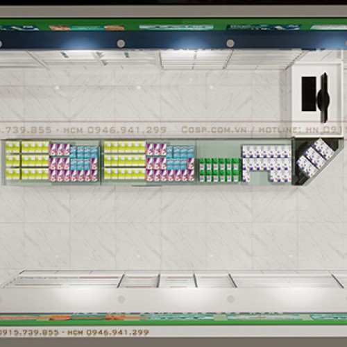 Kệ sữa được làm từ khung sắt sơn tĩnh điện kết hợp với các đợt gỗ MDF chống ẩm được chúng tôi bố trí ở cuối cửa hàng nhằm tận dụng triệt để không gian cũng như tạo sự thông thoáng cho cửa tiệm.