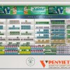 Việc sử dụng mẫu mã và các loại vật liệu phù hợp với đặc điểm trưng bày của từng sản phẩm cho thấy kinh nghiệm của các kiến trúc sư Penviet trong tư vấn thiết kế nội thất nhà thuốc chuẩn GPP.