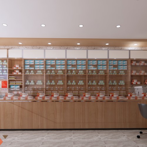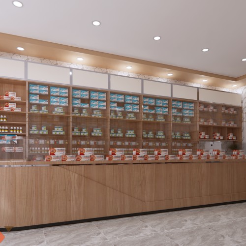 Phía sau là hệ quầy kệ đặt sát tường có nhiều ngăn, tầng khác nhau. Sự phân chia các ngăn tủ hợp lý sẽ giúp chủ nhà thuốc sắp xếp các sản phẩm dễ dàng theo chủng loại. Điều này quan trọng cho việc thống kê, lấy thuốc để bán cho khách hàng. Nhân viên dược sĩ không mất quá nhiều thời gian để tìm kiếm sản phẩm mình cần. Quầy cao gần sát trần nên tăng diện tích để sử dụng, tối ưu không gian.