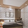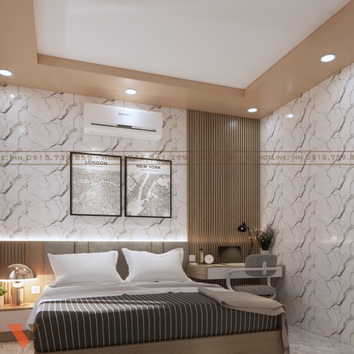 Vách trang trí đầu giường ốp lam gỗ kẻ sọc đầy ấn tượng, tạo điểm nhấn thu hút. Không gian ấm cúng, nhẹ nhàng và thư thái giúp chủ đầu tư có được giấc ngủ ngon lành nhất.