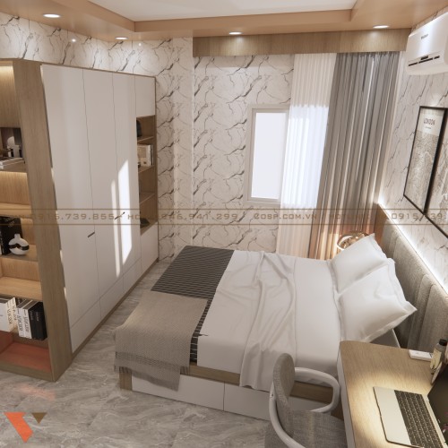 Phòng ngủ của chủ đầu tư nhà thuốc Nhân Khang có cách setup đơn giản nhưng hiện đại, tiện nghi. Từ đồ nội thất tủ quần áo, giường nằm hay tap đầu giường, bàn làm việc cũng được setup tỉ mỉ, khoa học. Chất liệu chủ đạo làm nên các đồ nội thất này chính là gỗ MDF cốt xanh bền bỉ.