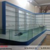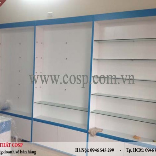 Tủ dựa tường được làm cao nhằm tận dụng không gian trên cao để trưng bày sản phẩm. Còn tủ thấp có mặt kính để đảm bảo an toàn cho sản phẩm trưng bày.