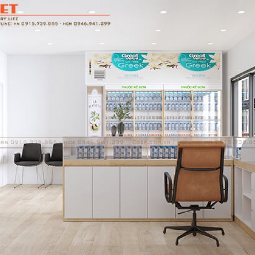 Thiết kế nhà thuốc này cũng được chúng tôi khéo léo lồng ghép nhận diện thương hiệu nhằm tạo ấn tượng và sự ghi nhớ đối với khách hàng.