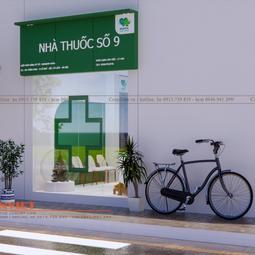 Thiết kế nhà thuốc sử dụng tone màu trắng và xanh cho mặt tiền của nhà thuốc. Tông màu này được lấy ý tưởng từ chính logo của nhà thuốc đã có. Nổi bật trên nền biển hiệu màu xanh là chữ thương hiệu “Nhà thuốc số 9” và các thông tin khác về shop như địa chỉ số điện thoại.