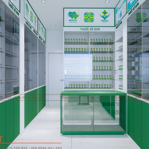 Thiết kế nội thất nhà thuốc sử dụng tông màu trắng và xanh vừa tăng độ nhận diện thương hiệu cho nhà thuốc vừa mang lại cảm giác an toàn cho khách hàng. Bố cục nội thất cho nhà thuốc theo dạng chữ U để tận dụng tối đa không gian trưng bày thuốc. Đường giao thông trong nhà thuốc cũng đảm bảo đủ rộng để thuận tiện di chuyển.