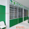 Hệ tủ thuốc được sử dụng trong thiết kế nhà thuốc số 9 bao gồm tủ thuốc cao sát tường với nhiều hệ tủ kính để trưng bày thuốc. Chất liệu sản xuất tủ thuốc là gỗ MDF Thái Lan hoàn thiện melamin, đợt tủ kính dùng kính cường lực 8mm đảm bảo việc trưng bày sản phẩm nhiều và nặng an toàn. Để không gian nhà thuốc không bị trống phía trên. Chúng tôi sử dụng tranh Formee trên thủ thuốc đảm bảo không gian sinh động hơn.