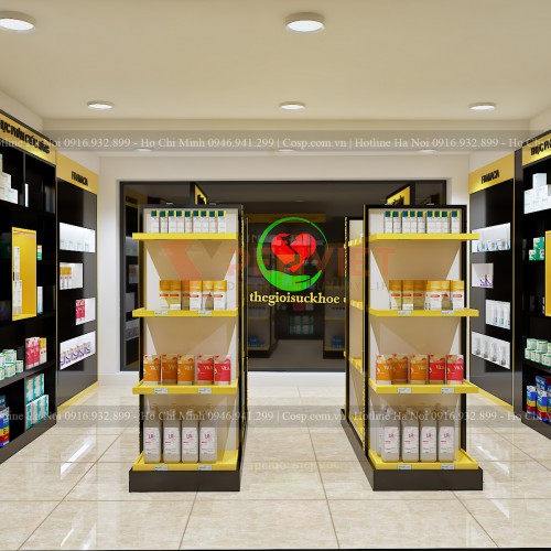 Mẫu nhà thuốc Thế giới sức khỏe này được chúng tôi lựa chọn thiết kế theo phong cách hiện đại bởi nó sẽ phù hợp hơn với một thiết kế nhà thuốc tây. Không sử dụng các gam màu truyền thống như trắng, xanh mà phá cách cùng tông màu vàng, đen mang đến ý tưởng vô cùng mới lạ cho không gian nhà thuốc.
