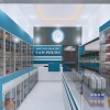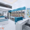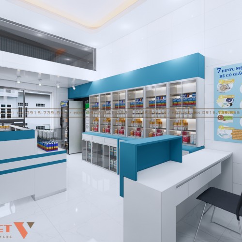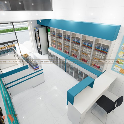 Góc bên trái của nhà thuốc là hệ tủ đặt sát tường làm từ gỗ MDF cốt xanh chống ẩm sơn màu xanh dương và trắng nổi bật. Tủ có mặt kính bên ngoài và chia nhiều ngăn nhỏ để đảm bảo thuận tiện cho bảo quản, trưng bày thuốc. Các sản phẩm thuốc được sắp xếp theo chủng loại, hãng sản xuất… đảm bảo dễ dàng cho khâu xuất nhập hàng.