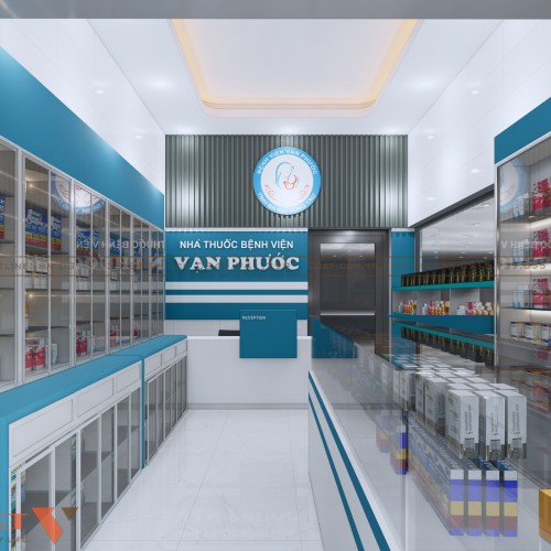 Thiết kế nội thất nhà thuốc bệnh viện Vạn Phước phân chia không gian làm nơi trưng bày thuốc và quầy thu ngân. Hệ tủ thuốc có kiểu dáng thiết kế chữ U hiện đại và mẫu tủ đặt sát tường để tiết kiệm không gian.