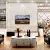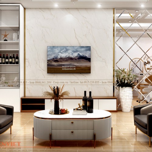 Thiết kế phòng lễ tân được đầu tư thiết kế tỉ mỉ từng chi tiết nhỏ. Ví dụ như vách tường kệ tivi được thay bằng vách PVC vân đá kết hợp hệ vách gương mài đầy mới mẻ.
