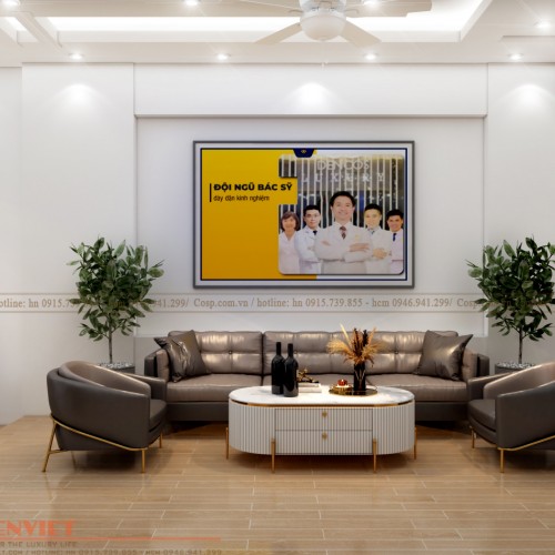 Đối diện được bố trí bộ bàn ghế sofa chân inox mạ vàng, bọc da cao cấp kết hợp bàn trà thiết kế hiện đại không chỉ mang đến trải nghiệm thoải mái cho người sử dụng mà còn giúp tổng thể thiết kế phòng khám nha khoa trở nên sang trọng hơn.