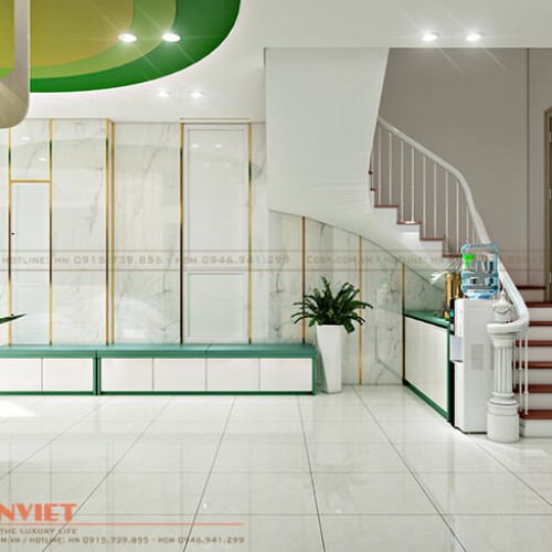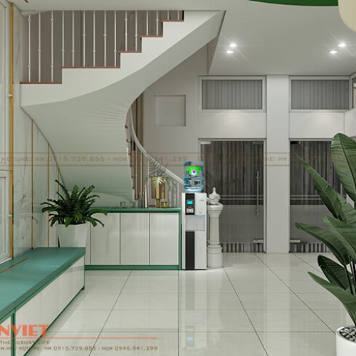 Chúng tôi kết hợp màu trắng và các gam màu sáng cho không gian giúp tạo hiệu ứng thị giác, giúp cho cơ sở y tế này trông rộng rãi, thoáng đãng hơn. Đồng thời, việc này cũng làm nổi bật những chi tiết trang trí màu xanh lá được sử dụng để làm điểm nhấn cho thiết kế phòng khám.