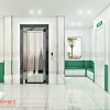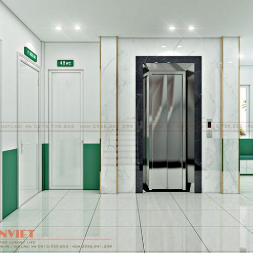 Với các vách tường, vách thang máy, chúng tôi sử dụng vật liệu PVC vân đá, nẹp nhôm màu Inox nhằm mang đến sự sang trong cho không gian.