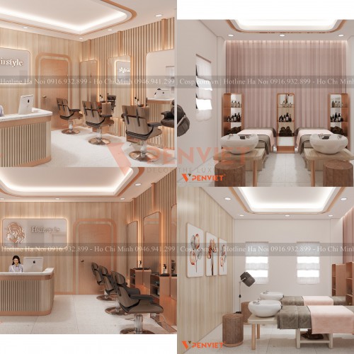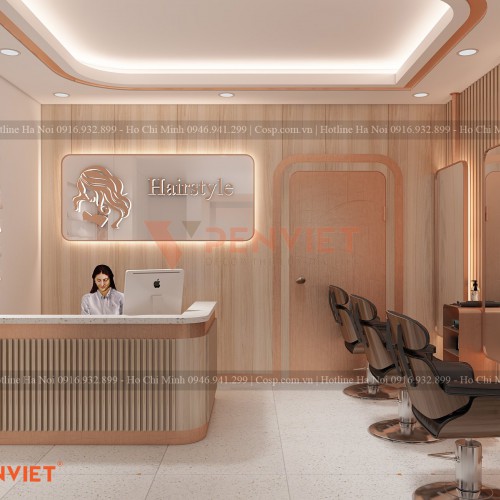 Logo “Hairstyle” sáng chân tinh tế được làm nổi bật bởi dàn đèn led hắt sáng bao quanh. Ánh sáng tạo nên sự ấm áp, nhẹ nhàng cho không gian.