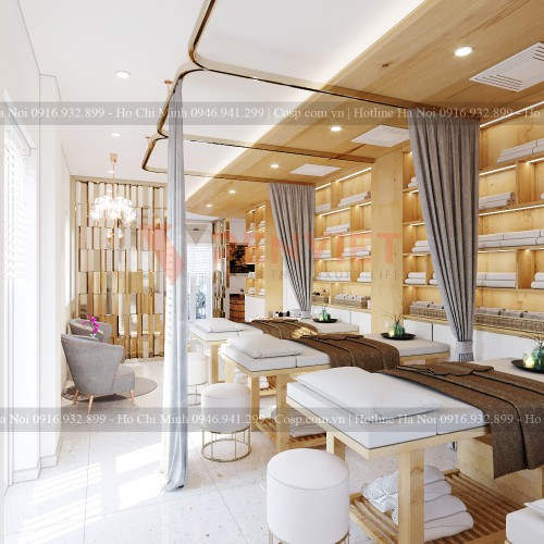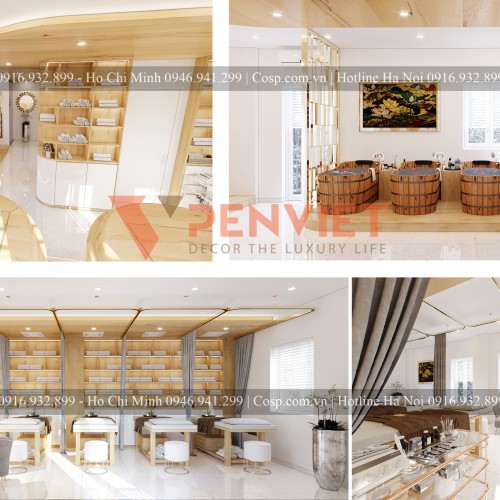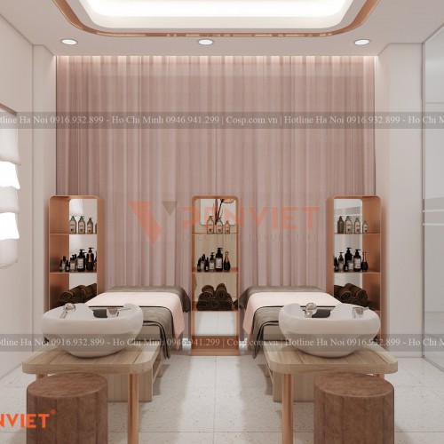 Toàn bộ các giường trong phần bản vẽ thiết kế spa mini này đều được Penviet thi công bằng gỗ tự nhiên. Giường massage còn được kết hợp vật liệu cao cấp cùng các khung inox mạ đồng và rèm tạo nên những không gian riêng tư để khách hàng thoải mái thư giãn.