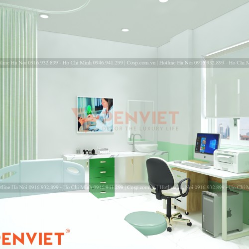 Phòng khám chuyên khoa sử dụng nội thất đơn giản, hiện đại. Gỗ MDF phủ Melamine dày 18mm được sử dụng linh hoạt trong các mẫu bàn, tủ, thiết kế chân bàn sử dụng sắt hộp mạ kẽm vững chãi, có độ bền cao.