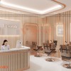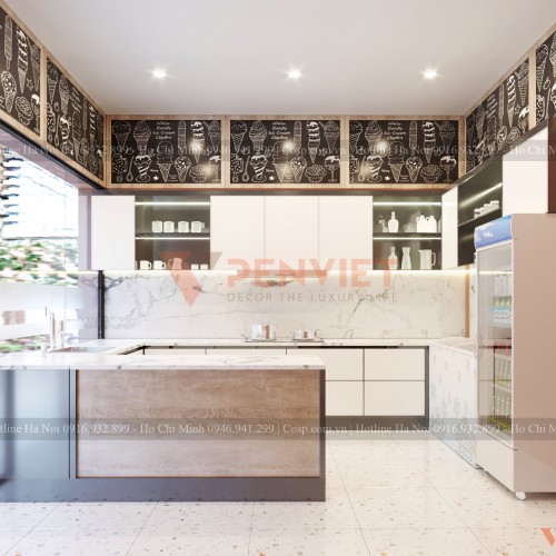 Khu vực bán kem được xây dựng như một điểm nhấn trong thiết kế không gian tầng 1. Gam màu nâu trầm sử dụng tại quầy, các khung trang trí sơn mạ vàng không làm mất đi tổng thể sang trọng. Mặt đá Marble được khéo léo đưa vào phù hợp với kết cấu, yêu cầu thi công.