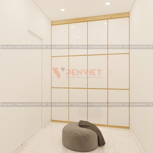 Phòng thay đồ kín đáo với màu trắng làm chủ đạo với tủ bằng gỗ MDF phun sơn dễ dàng, linh hoạt trong thi công.