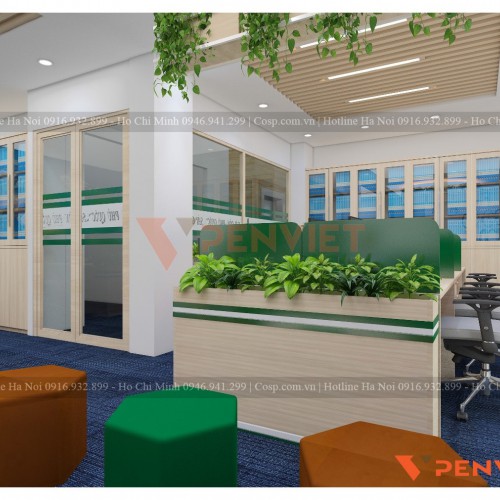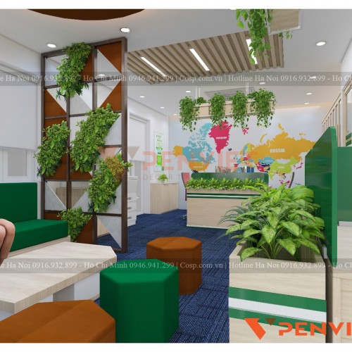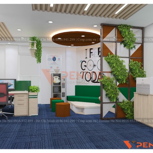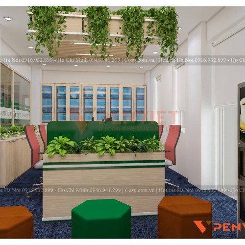 Penviet thiết kế một khu vực tiếp khách xinh xắn với không gian như một quán café đáng yêu tạo sự tươi mới cho không nội thất. Không gian khu vực này như một văn phòng làm việc, về phần này, tôi xin giới thiệu bạn đến với hàng loạt những mẫu thiết kế văn phòng nhé.