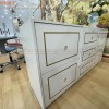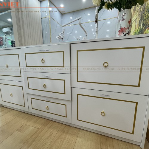 Tại sảnh đón khách, PenViet tư vấn sử dụng quầy thu ngân làm từ lam gỗ MDF chống ẩm phủ Melamine thiết kế hiện đại với các góc bo tròn giúp hạn chế tình trạng va đập, gây nguy hiểm cho người sử dụng. Các chi tiết viền phun sơn nhũ vàng vừa tạo điểm nhấn thu hút, vừa mang tới vẻ sang trọng cho thiết kế nội thất phòng khám nha khoa Bích Ngọc.