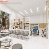 Vị trí của khu vực tiếp khách được tính toán nhằm tạo sự thuận tiện cho nhân viên và khách hàng. Quầy thu ngân bằng gỗ MDF kết hợp dán PVC vân đá, đèn Led trang trí mang đến sự hiện đại, sang trọng cho không gian.