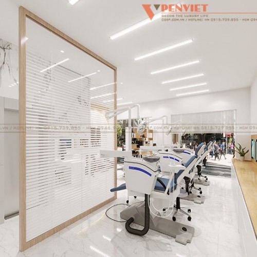 Để ngăn cách phòng khám răng với khu vực tiếp khách, Penviet lựa chọn vách ngăn bằng kính, khung gỗ MDF phủ Melamine. Loại vật liệu này không những giúp ánh sáng dễ dàng xuyên qua mà còn mang đến sự hiện đại, chuyên nghiệp cho mẫu thiết kế phòng khám này.