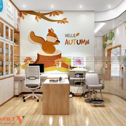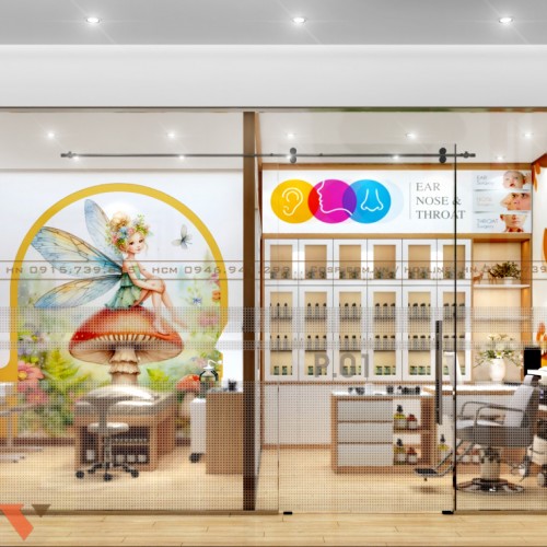 Tiếp đến là không gian khu vực phòng khám tai mũi họng được ngăn cách với khu vực ngoài với vách kính mờ. Vách kính thiết kế bo tròn đảm bảo an toàn tối đa cho bệnh nhân đến thăm khám, đặc biệt các bạn nhỏ hiếu động.