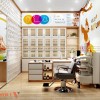 Ngoài ra, ở chính giữa sảnh lễ tân được setup hệ quầy trưng bày sản phẩm cao tầm trung. Hàng hóa được trưng bày trên mặt quầy thu hút sự quan tâm của khách hàng đến khám chữa bệnh.